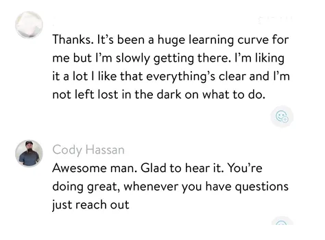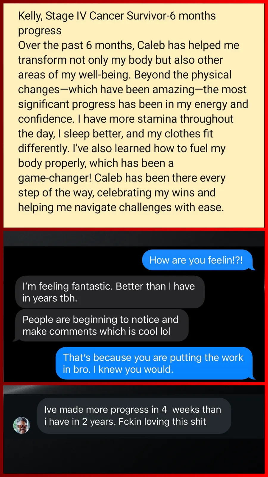 "In 6 months, Caleb helped me rebuild my energy, confidence, and strength after cancer. I sleep better, have more stamina, my clothes fit differently, and I finally learned how to fuel my body properly. Beyond the physical changes, his constant support and guidance have been a true game-changer."