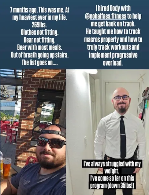" Later than my hernia surgery, I went from shredded to lost, stuck on 1,600 calories and gaining weight. In just 1 month with Caleb, I dropped from 215 lbs to 190 lbs, healed faster with better nutrition, and learned fitness doesn’t have to be suffering. He gave me the tools, support, and community I now use to coach others."